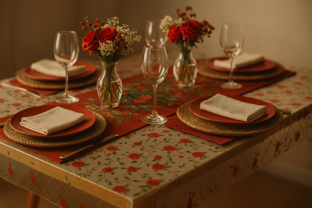 - Outono/Inverno: migre para botânicos em tons queimados (terracota, oliva, mostarda) e florais miúdos; promova, assim, kits de mesa aconchegantes.