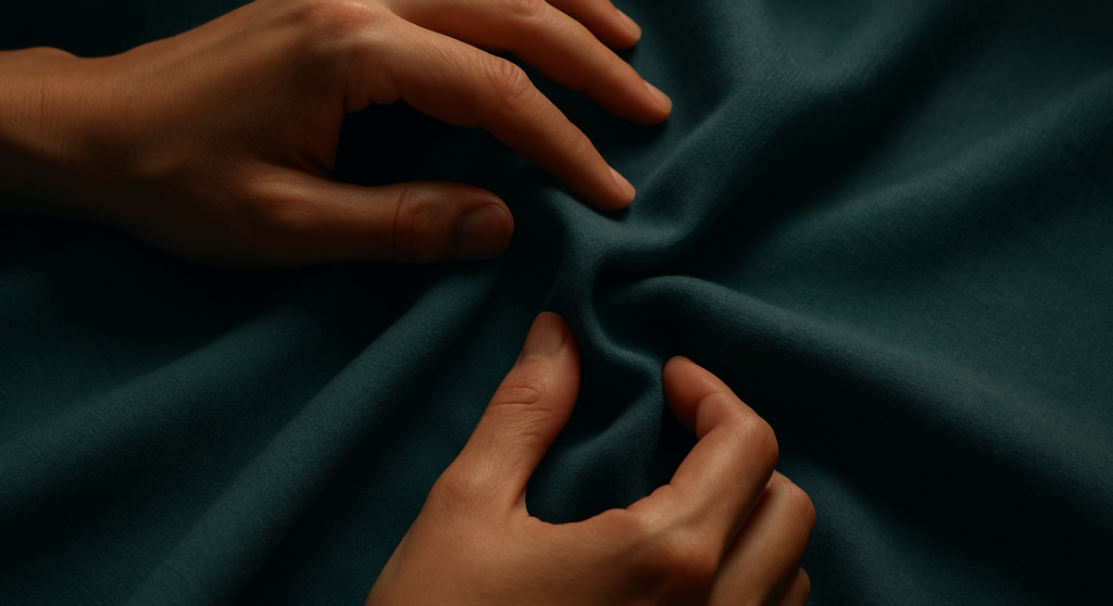 - Amasse o tecido na mão: assim você sente o toque real e percebe se ele marca muito ou se volta facilmente ao lugar.