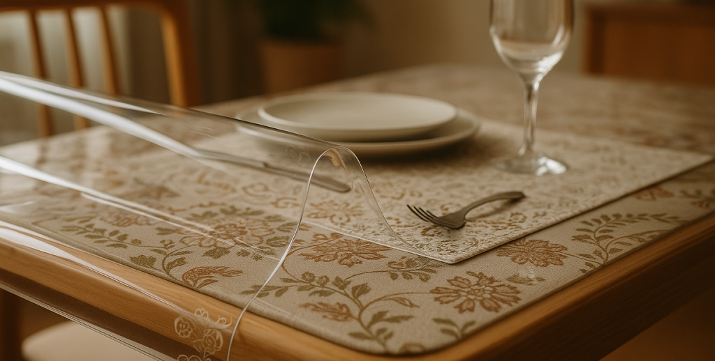 Toalha de mesa cristal: filme de PVC transparente ou translúcido, liso ou com desenhos aplicados. Como é cristalina, preserva a estética do tampo e das louças, deixando apenas a estampa “flutuar” quando houver desenho. É impermeável, prática para o dia a dia e muito usada sobre mesas de madeira, vidro ou sobre toalhas de tecido, protegendo sem ocultar.