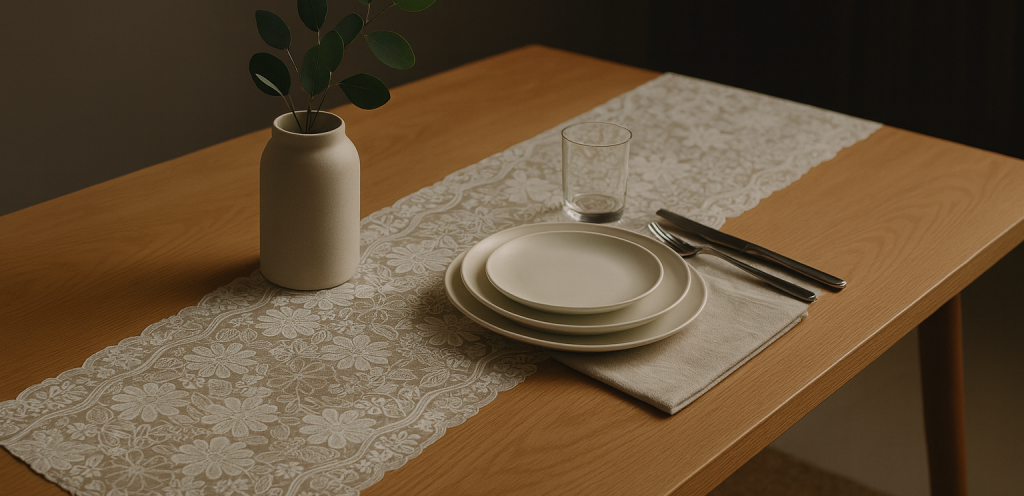 O trilho funciona como eixo da mesa e, assim, delimita o centro de interesse, apoia arranjos e louças e, ao mesmo tempo, revela parte do tampo, reforçando a sensação de amplitude. Além do mais, o consumo é mais versátil: uma peça resolve o “caminho” visual e permite variações rápidas com jogos americanos ou sousplats. Em vitrines e fotos, isso se traduz em composições limpas, de leitura imediata e com apelo contemporâneo; portanto, é uma solução que eleva percepção de valor com baixo ruído.