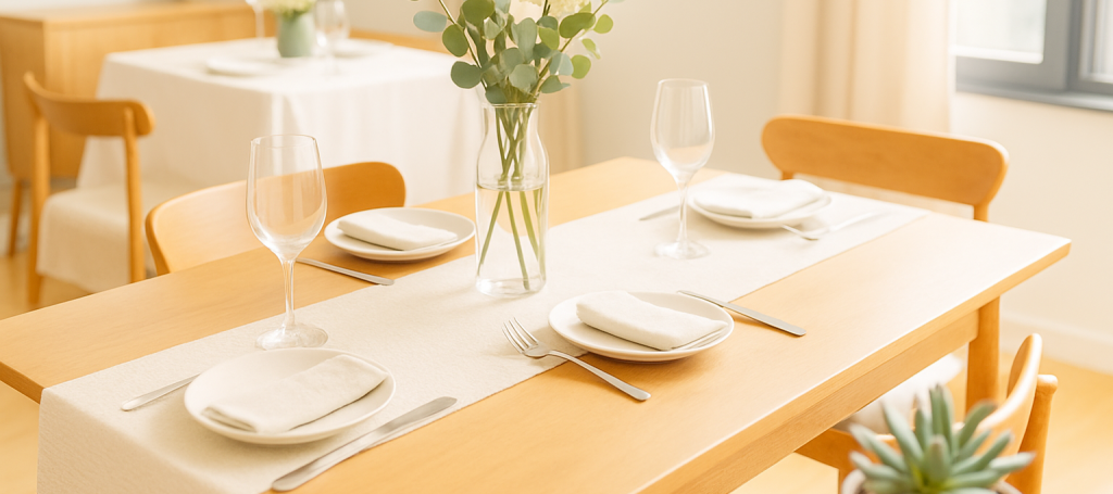 A toalha de mesa é indicada para situações formais ou acolhedoras, nas quais o foco é criar um ambiente completo e protegido — ideal para almoços de domingo, festas familiares ou datas comemorativas.